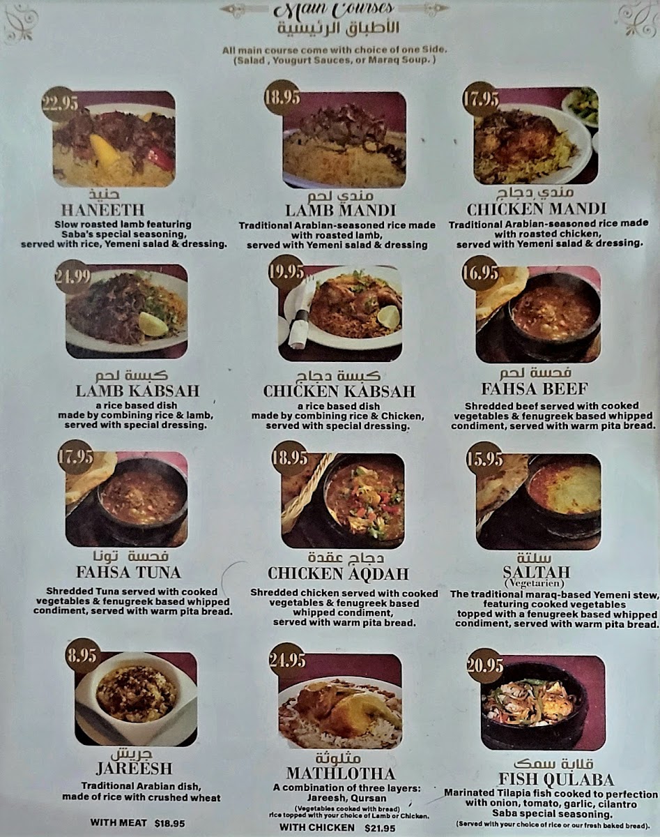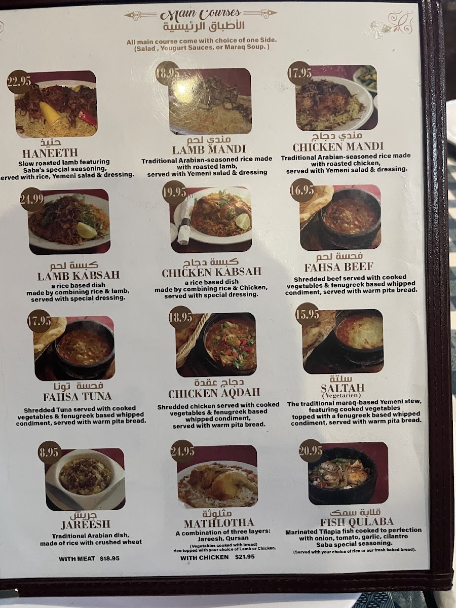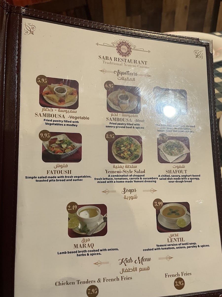 Welcome to Saba Restaurant, a culinary gem located in Fairfax, VA, specializing in authentic Yemeni cuisine. The menu showcases a delightful array of dishes, making it a must-visit for food enthusiasts. Start with their Maraq soup, a comforting and flavorful choice, perfect for those cold days or when you're feeling under the weather. The hummus and baba ghanoush receive rave reviews for their rich taste and smooth textures.